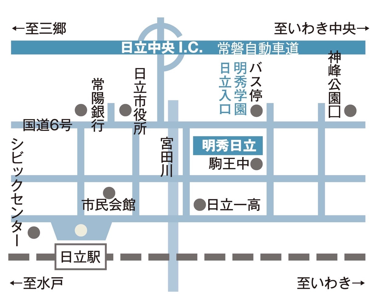 IC出口からトンネル(日立有料道路)を抜けて突き当りを日立市街方面へ左折してください。国道6号との交差点を左折し、坂を上って一つ目の信号「神峰町」を右折すると右手に正門がございます。